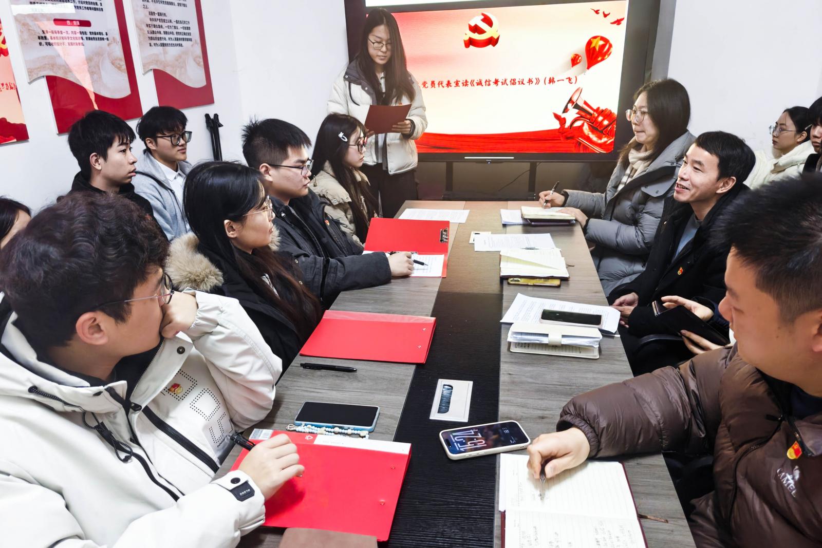 韩一飞同志作为学生党员代表宣读《诚信考试倡议书》,呼吁同学们诚信应考,维护考试的公平公正。全体学生党员签署《诚信考试承诺书》,以实际行动彰显诚信考试的决心。