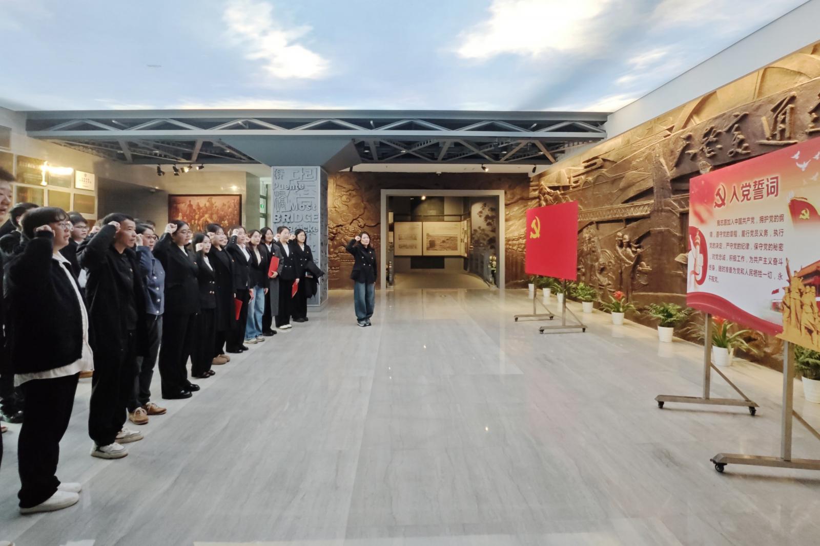 在中国桥梁博物馆大厅,建筑工程学院党总支副书记汪正君同志带领全体党员重温入党誓词。