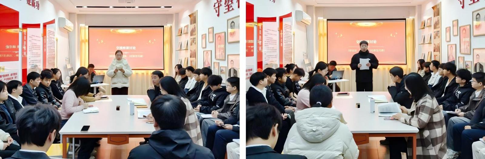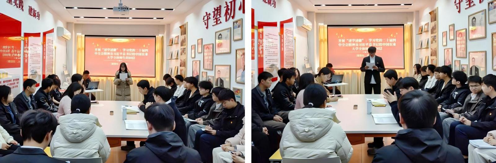 学生党员代表魏雪怡、梁国贵围绕党的二十届四中全会精神,结合习近平总书记给中国农业大学全体师生回信,分享“学思用贯通、知信行统一”的学习体会,提出“以匠心育匠人、以强基筑强国”的专业思考。