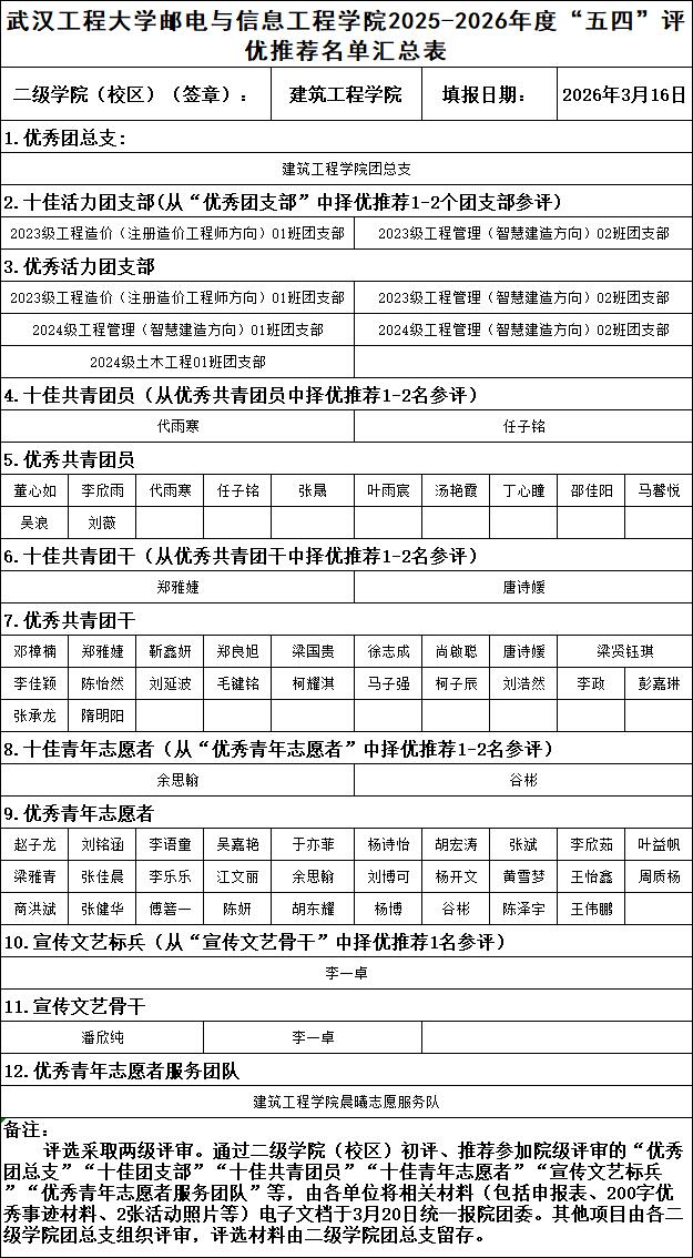 为表彰先进,树立榜样,激励广大青年学生积极进取、奋发向上,依据《关于开展武汉工程大学邮电与信息工程学院2025-2026学年“五四”评优工作的通知》及相关评定标准与流程,经个人申报、班级推荐、学院审核等环节,现将推荐名单予以公示。