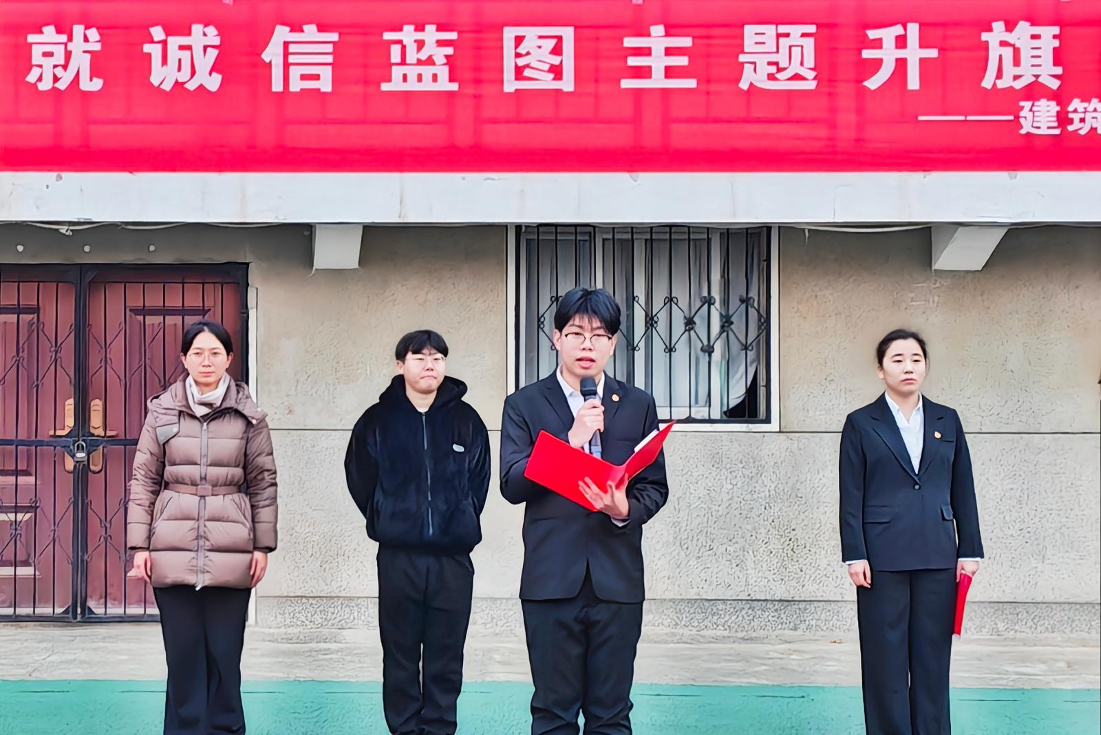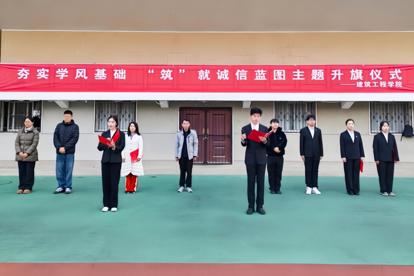 (通讯员 龙韵泽 摄影 李一卓)为深入落实立德树人根本任务,按照学院关于优良学风建设的部署要求,进一步营造良好的学习氛围,2025年12月8日早晨,建筑工程学院在运动场举行“夯实学风基础 ‘筑’就诚信蓝图”主题升旗仪式。建筑工程学院班子成员,辅导员,党员代表及学生代表参加升旗仪式。